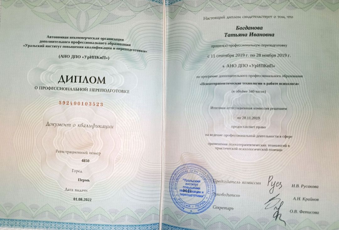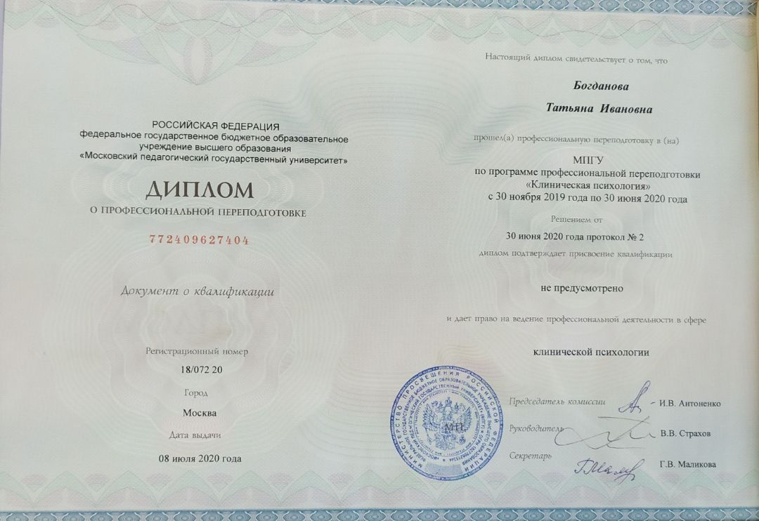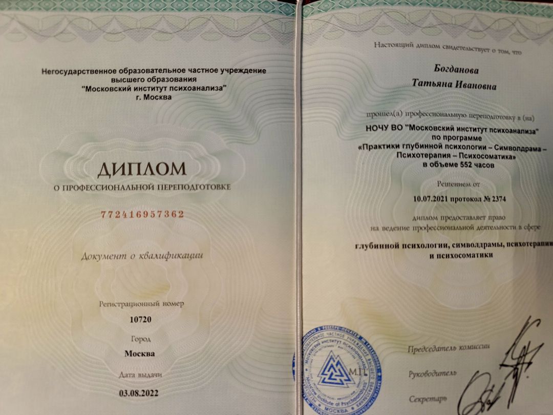 Здравствуйте и добро пожаловать на мой сайт! Меня зовут Татьяна Ивановна Богданова и я практикующий психолог. Работаю по предварительной записи в режиме онлайн. Также принимаю очно в Москве и г. Сергиев Посад. Практикую с 2017 года. За всё время моей работы я получила высшее психологическое образование, несколько международных дипломов по психоанализу. Диплом супервизора Балинтовских групп.