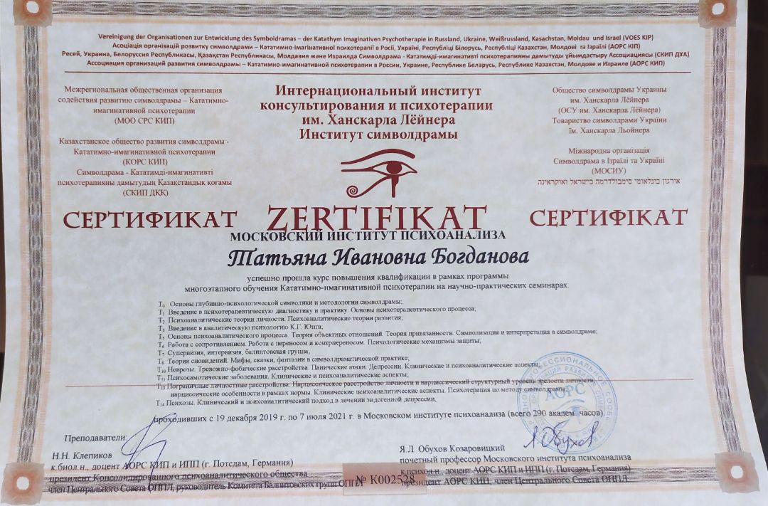Диплом повышения квалификации - практика глубинной терапии, Символдрама, психосоматика
