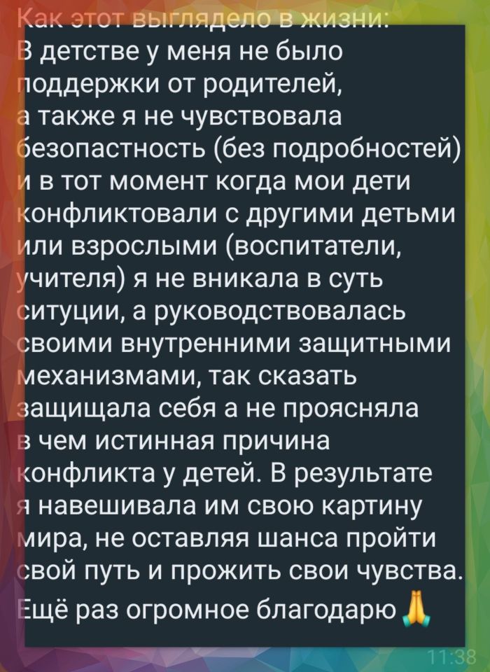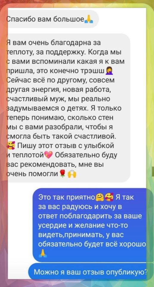 Мы обсудим ваши новые появившиеся мысли, это обсуждение поможет вам почувствовать изменения в вашем состоянии и вы сможете принять решения для нашей дальнейшей работы
